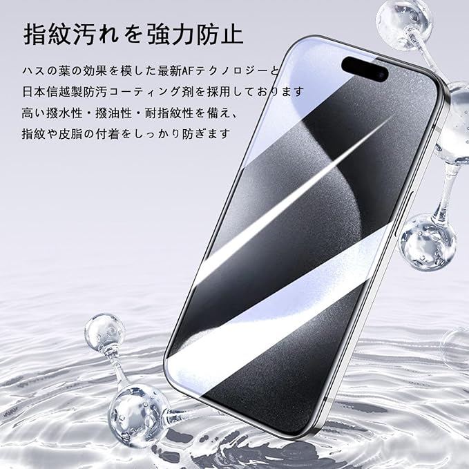 超撥水超撥油・指紋汚れを強力防止:アイフォン16proガラスは、ハスの葉の効果を模した最新AFテクノロジーと日本信越製防汚コーティング剤を採用しております。高い撥水性・撥油性・耐指紋性を備え、指紋や皮脂の付着をしっかり防ぎます。指紋を気にすることなく日常的に使用し、画面をいつも綺麗に保つできます。