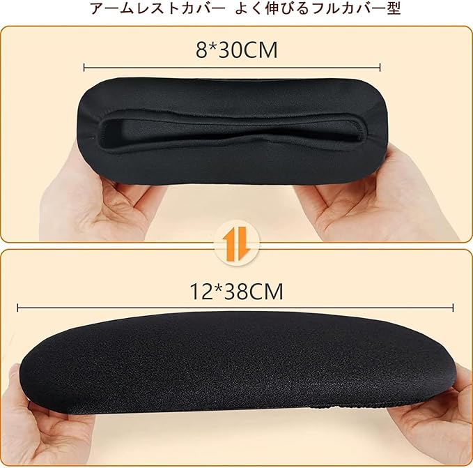 アームレストカバー よく伸びるフルカバー型 :オフィスチェア、ゲーミングチェア、ワークチェアなどの椅子にはもちろん、車のアームレストカバーとしてもお使いいただける。弊店の肘掛けカバーはポリエステルにて作られていますので、伸縮性があります。手触りと肌触りは心地良く、気楽になります。人工皮革のペタペタとくっつく不快さや衛生面を気にされている方には大変オススメです。