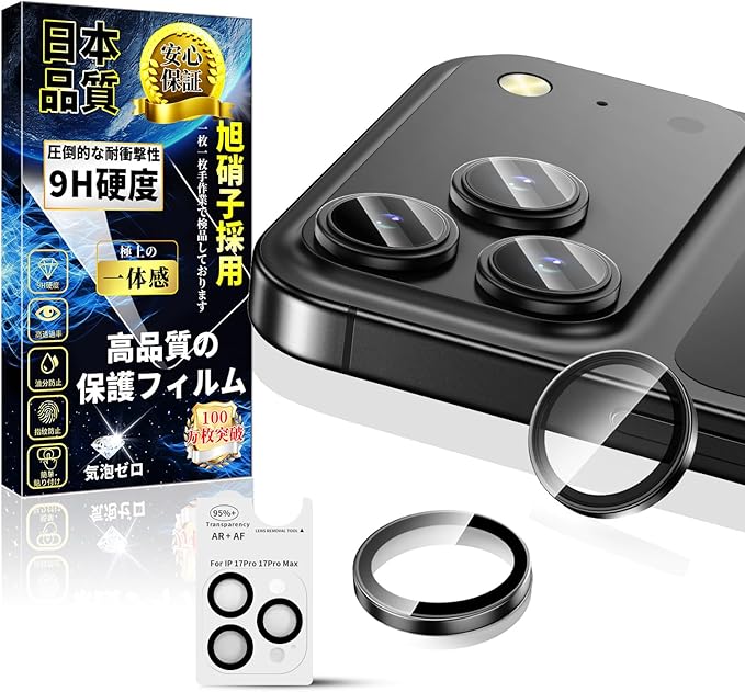 【宇宙航空アルミ合金材料・対応機種】iPhone 17 Pro / 17 Pro Max カメラフィルム。 超高硬度9Hのアルミ合金フレームと強化ガラスを採用。360 の全面防護システムを構築します。日常のキズはもちろん、誤って落とした時の衝撃も吸収・分散し、カメラレンズの割れを根本から防止。高額な修理代からあなたの愛機を守ります。