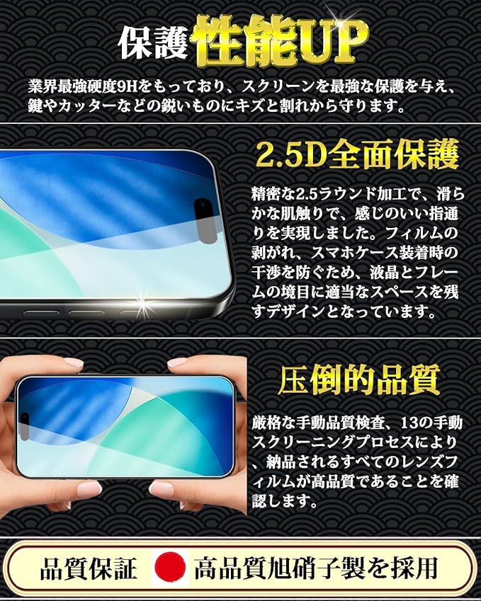 【日本旭硝子素材採用!圧倒的な耐衝撃性】徹底的にこだわった品質、信頼できる日本製旭硝子素材を採用、通常ガラスフィルム などと比べ、強度、耐傷性、質感のすべてにおいて優れた性質を持ちます。安心してご使用いただけるように、一枚一枚、手作業で検品しておりました。また、ガラスフィルム卓越した耐衝撃性能を持って、落下への衝撃からしっかりと保護。万が一強力な衝撃でガラスフィルムが割れてしまっても、破片の飛び散りを防ぐ飛散防止コート処理で、画面をしっかり保護、スマートフォン をよく保護できます。
