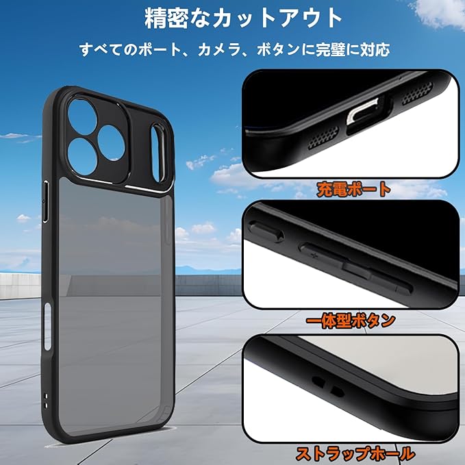 【半透明デザイン 精密な穴あけ】クールでスタイリッシュな半透明の背面デザインが、高級感と神秘感を漂わせながら、かすかに透けて見えるデザインです 誤差の無い1:1のカットアウトを実現。各種ボタンやホールに問題はなく、ケースをつけたまま、充電、写真撮影、ボタン操作、通話などの操作ができ、右下には便利なストラップホールがあり、お好きなストラップを付けられ、落下防止にも効果的です