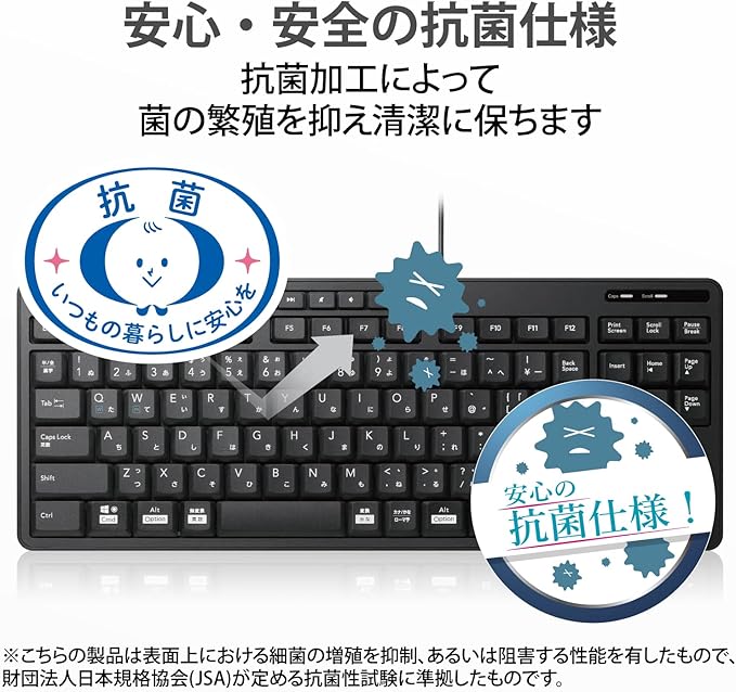本格静音設計。Windows、Chrome OS、macOSで使用可能。さらに、日々のパソコン操作に安心をプラスする抗菌仕様の有線静音テンキーレスキーボード。