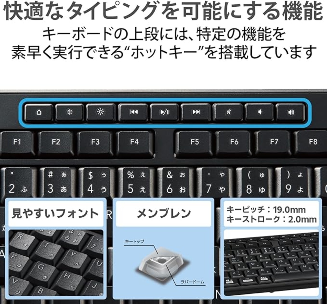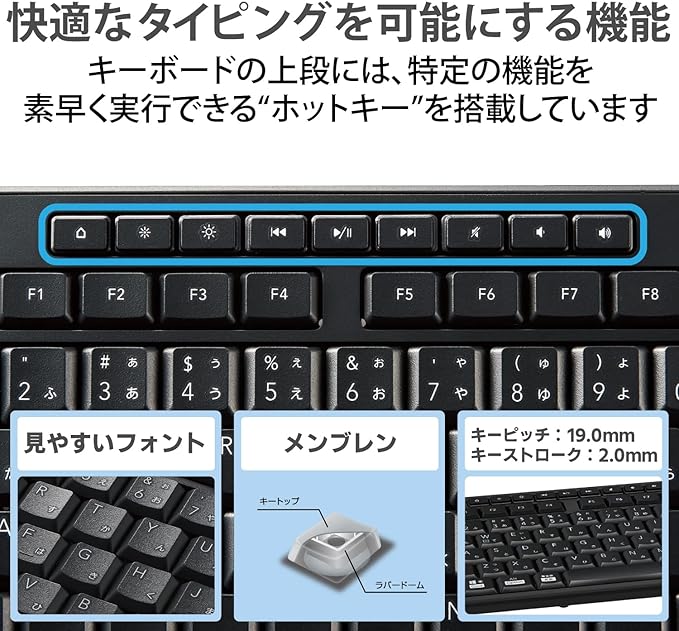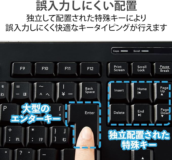 ■大型のエンターキーや、独立して配置されたDelete、Insertなどの特殊キーにより、誤入力しにくく快適なキータイピングが行えます。また、打鍵しやすいキーピッチ19mmで快適なタイピングが可能です。