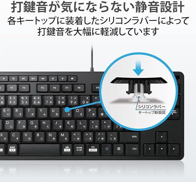 ■音が気になる場所や時間帯での使用に適した有線タイプの静音コンパクトキーボードです。デスク周りのスペースを有効に使えるテンキーレスタイプです。