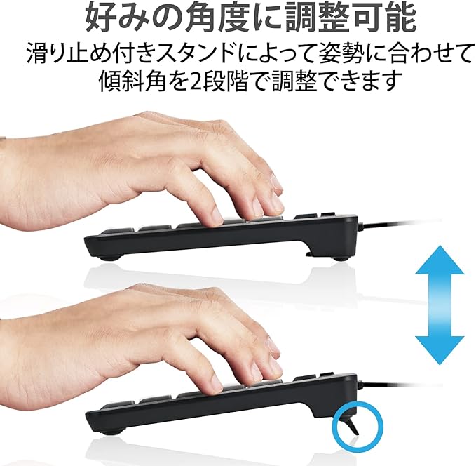■姿勢に合わせて傾斜角を2段階で調整できる“角度調整スタンド"付き。また、スタンドにはしっかりしたキータッチに役立つ“すべり止め"が付いています。
