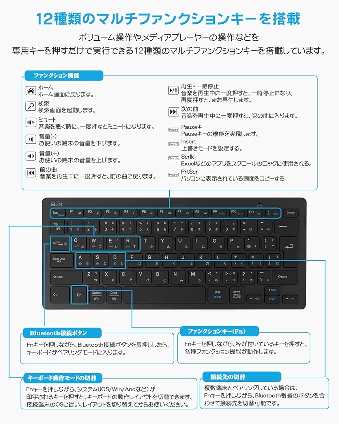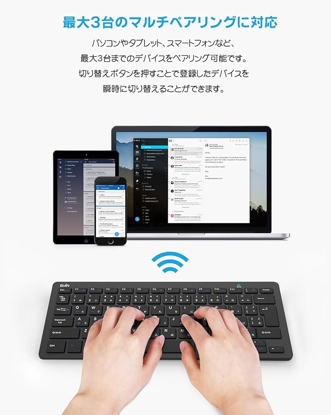 Ewin キーボード ワイヤレス bluetooth 小型 キーボード JIS基準 日本語配列 ios android Windows mac多システム対応 iphone ipad パソコン スマホ タブレット 三つデバイス自由に切替え 軽量 超薄型 日本語説明書 ブラック