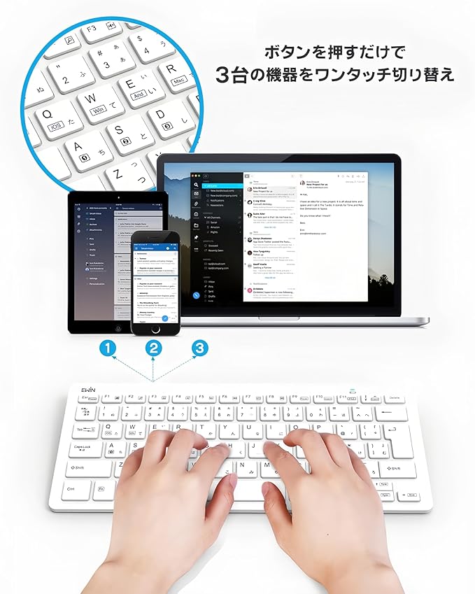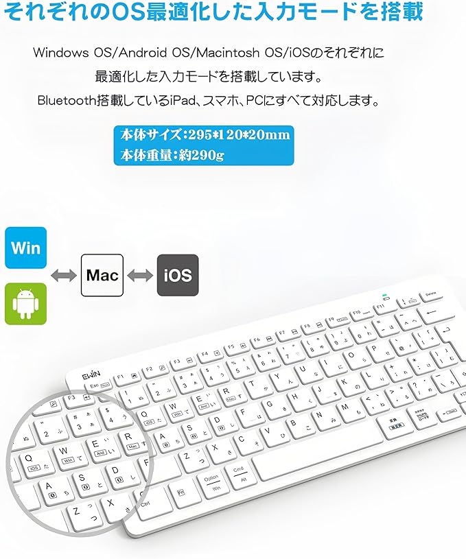 Ewin キーボード ワイヤレス bluetooth JIS基準日本語配列 かな入力 Mac iOS Android Windows など対応 マルチデバイス接続可能 小型 静音 薄型 軽量 コンパクト PC ノートパソコン スマホ タブレット (ホワイト)