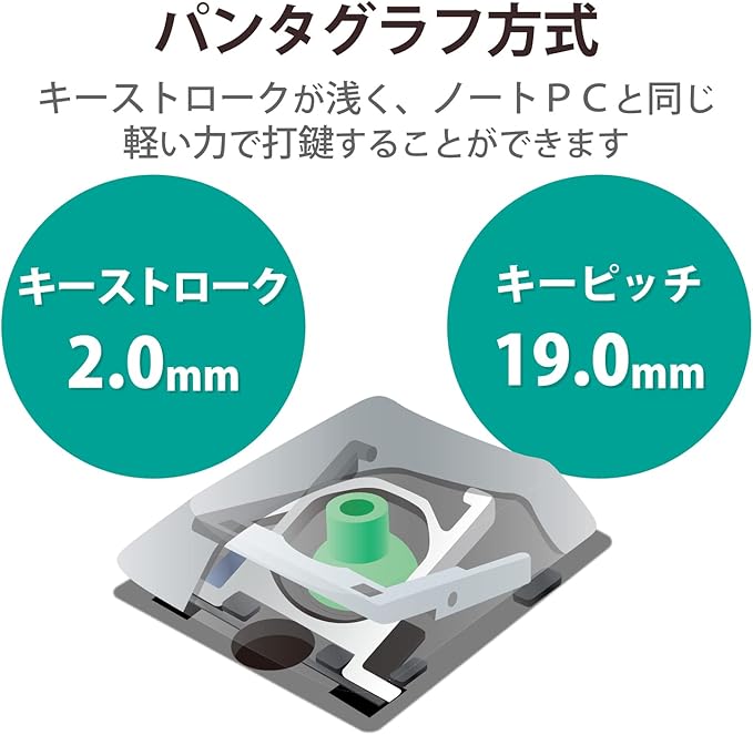 キータイプにはノートパソコンのキーボードと同じ軽い力で打鍵できる「パンタグラフ方式」を採用しています。