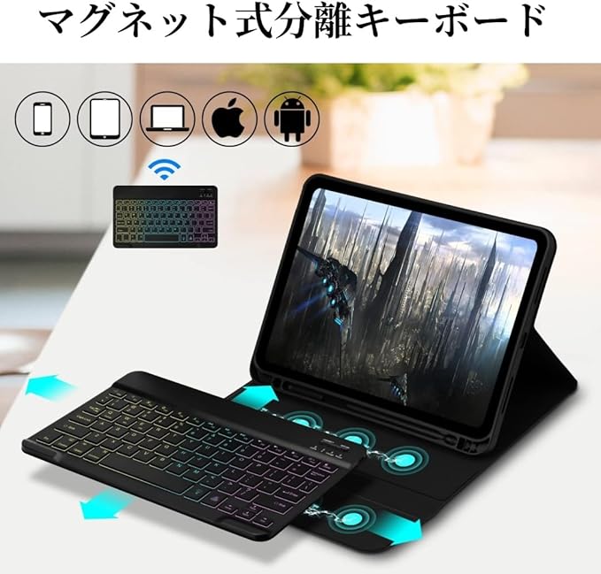 マグネット分離式キーボード: キーボードはマグネット便り式なので便利。必要なときは装着して作業効率アップ、不要時はケース単体でスリムに持ち運び可能。