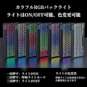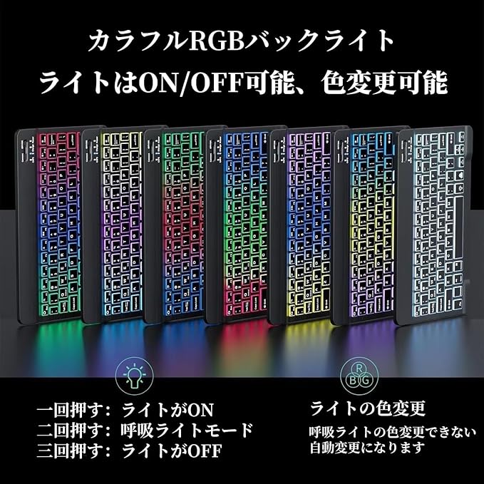 3種類のバックライト搭載:Bluetoothキーボードは3種類のバックライト付き、単色(1色)、3色(7色)、イルミネーション呼吸モードの3パターンを搭載。暗所でも快適にタイピングでき、気分や環境に合わせて光色を切り替え可能。バックライトのON/OFFも可能です。