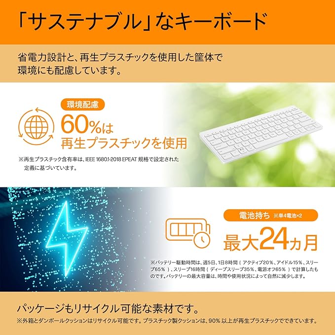 【サステナブルなキーボード】電池が最大2年間(24カ月)の長持ち省電力設計と、再生プラスチック(筐体のうち60%)を使用した筐体で、環境にも配慮しています。パッケージもリサイクル可能な素材です。