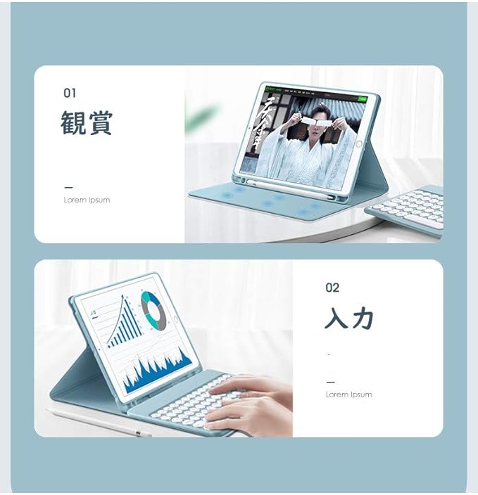 ワイヤレスマウス付き:キーボードケースとマウス付のセットで使い勝手がよい、iPadはまるでノートパソコンのように利用できます。マウスはBluetoothで接続簡単、充電式で便利。