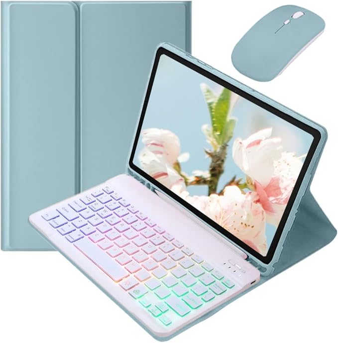 Disonbeir カラフルバックライト 対応 Xiaomi Redmi Pad SE 11インチ キーボードケース マウス付き おしゃれ かわいい バックライトキーボード ケース 分離式 女性 学生 ビジネス ,霧ブルー+白