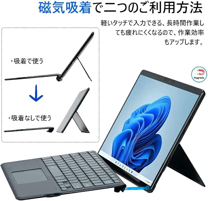 色:写真色<br> 対応機種:Microsoft Surface Pro8/ProX<br> サイズ:289*225*7mm <br> 素材:PU+ABS<br> パッケージ内容:包装*1、本体*1、USBケーブル*1<br> 企画 生産: 企画 日本 生産 中国<br><br> ■接続方式: Bluetooth(R)無線方式<br> ■インターフェイス:Bluetooth(R)5.0<br> ■USB充電式:Type-C<br> ■待機時間:100日間<br> ■充電時間:2-3H<br> ■稼働時間:30H<br> ■バッテリー容量:480mAh<br> ■通信距離:10m(使用環境により異なります。)<br> ■電池寿命:約3年<br> ■動作力(キーボード):80g<br> ■キーボード寿命:クリック500万回<br> <br>