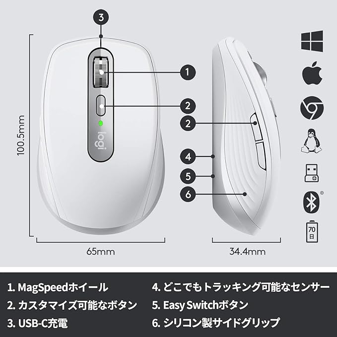 ボタン ボタン: 6 個のボタン(左/右クリック、戻る/進む、ホイール モードシフト、ミドルクリック) スクロール ホイール: あり(自動切り替え機能付き) 水平スクロール: あり(サイドボタンを押しながら、ホイールを回す)
