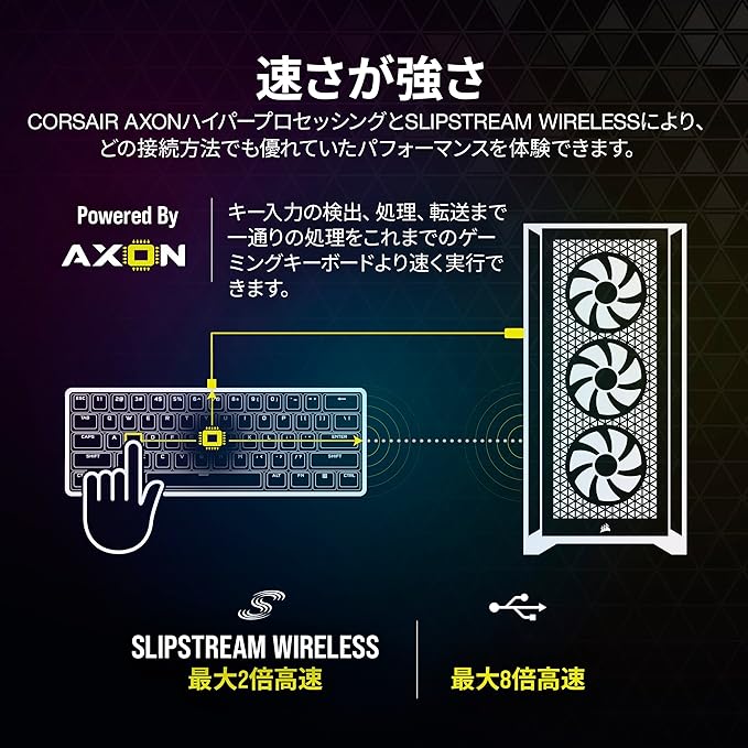 SLIPSTREAMワイヤレス 、Bluetooth、USB有線から選べる接続方法。AXONテクノロジーによる8,000Hzのハイパーポーリングも利用できます。