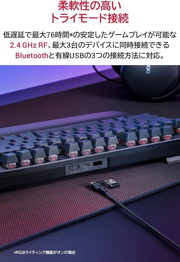 トライモード接続で多様なデバイスに対応:ASUS ROG Strix Scope RX TKLは、2.4GHz RFワイヤレス接続を利用して最大76時間の低遅延ゲームプレイを実現し、快適なゲーミング体験を提供します。さらに、Bluetooth対応により最大3台のデバイスと同時接続・簡単に切り替えが可能で、スマートフォンやタブレットともシームレスに連携できます。標準的な有線USB接続もサポートしており、どのような使用環境にも柔軟に対応します。