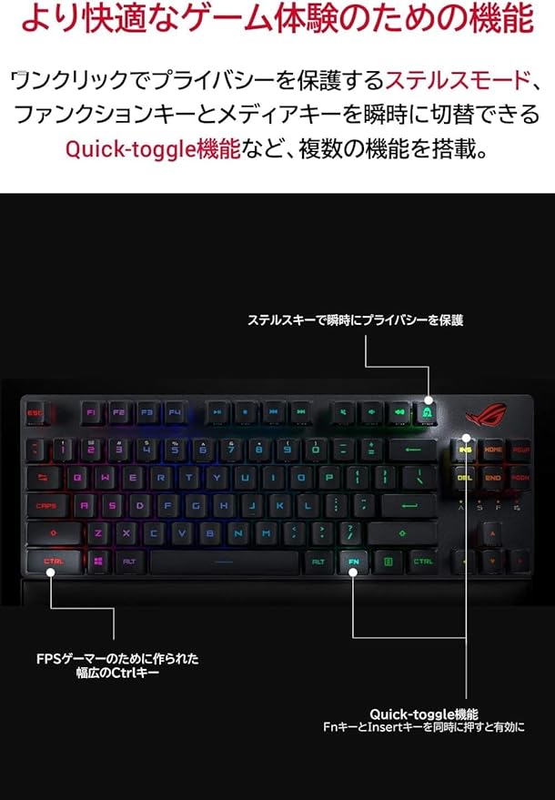 特徴 ゲーミングキーボード ワイヤレスキーボード メカニカルキーボード ROGキーボード TKLキーボード RGBバックライト keyboard gaming 日本語配列 Bluetooth対応 2.4GHz無線 FPS対応 マクロ対応 赤軸 キーボード ステルスキー クイックトグル USB有線接続 ゲーマー用キーボード, 直感的な操作を実現するQuick-toggleスイッチ<br> Quick-toggleスイッチを使用することで、ファンクションキーとメディアキーの入力をワンタッチで切り替えることができます。これにより、操作性が向上し、ゲーム中や作業中に迅速に必要な機能にアクセスできます。直感的な操作性が、ユーザーの利便性を大幅に向上させます。ゲーミングキーボード ワイヤレスキーボード メカニカルキーボード ROGキーボ… 表示を増やす