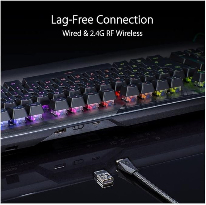ROG RXオプティカルメカニカルスイッチ:RX Redスイッチはセントラルライティング機能を備え、低遅延でブレのない安定したキーストロークを実現 ●遅延のない接続: 有線または2.4 GHzワイヤレス接続の両方に対応した、わずか1ミリ秒の高速応答