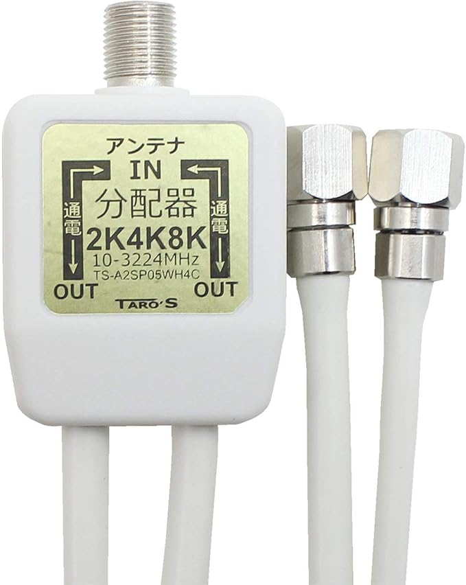 アンテナ分配器 4K8K・地デジ・BS・CS・CATV放送対応 2分配 ケーブル一体型(50cm) 出力側ケーブル付き 全端子電流通過型 日本仕様 ホワイト TS-A2SP05WH4C TAROS