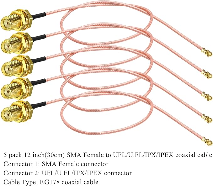 パッケージ内容: SMAメスからUFL/U.FL/IPX/MHF1同軸ケーブル5本(コネクタ1: SMAメスコネクタ、コネクタ2: IPXコネクタ、ケーブルタイプ: 12インチRG178同軸ケーブル)