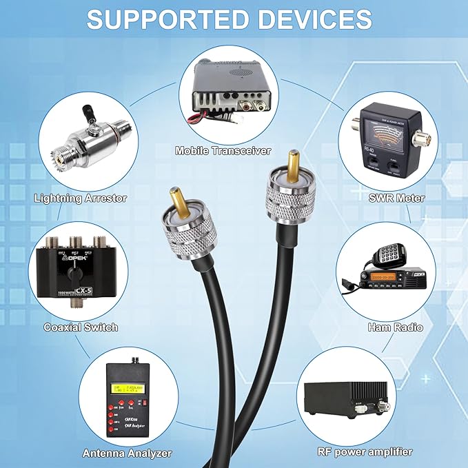 耐久性と性能: コネクタは純粋な真鍮製で、耐久性とリサイクル性を確保しています。ケーブルタイプはRG58で、優れた導電性と信号伝送を確保し、信号干渉に非常に強いです。