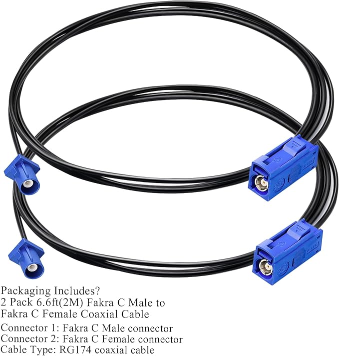 パッケージ内容: FakraC オス - FakraC メス同軸ケーブル 2 本 (コネクタ 1: Fakra C オス コネクタ、コネクタ 2: Fakra C メス コネクタ、ケーブル タイプ: RG174 同軸ケーブル)