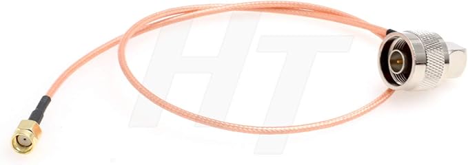 N型オスコネクタからRP-SMAオスコネクタ(中央のメスピン)、金メッキ、ニッケルメッキ、テフロン熱収縮ストレインリリーフ。