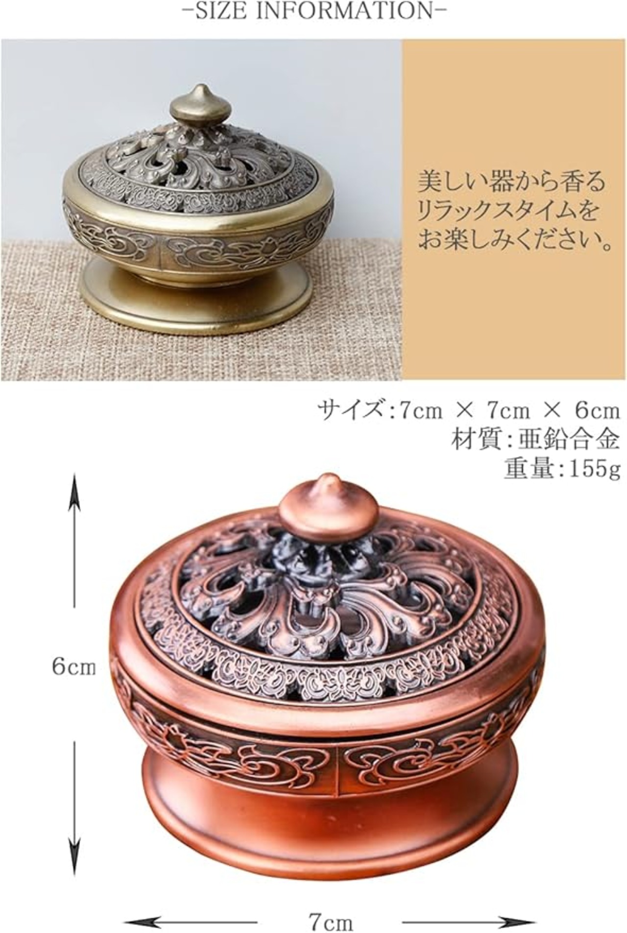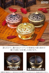 【注意事項】 ※お香のコーンタイプやステックタイプ、お線香、線香立て、香炉灰などは付属されていませんので、別途お求め下さい。 ※直接、合金に火がかからないように香炉灰やお線香立てなどをご使用ください。 ※香炉灰のご使用の場合、香炉の半分を目安に香炉灰を入れていただき、その上にお香を乗せてください。 ※香炉の蓋の汚れが気になる場合は、外してご使用ください。