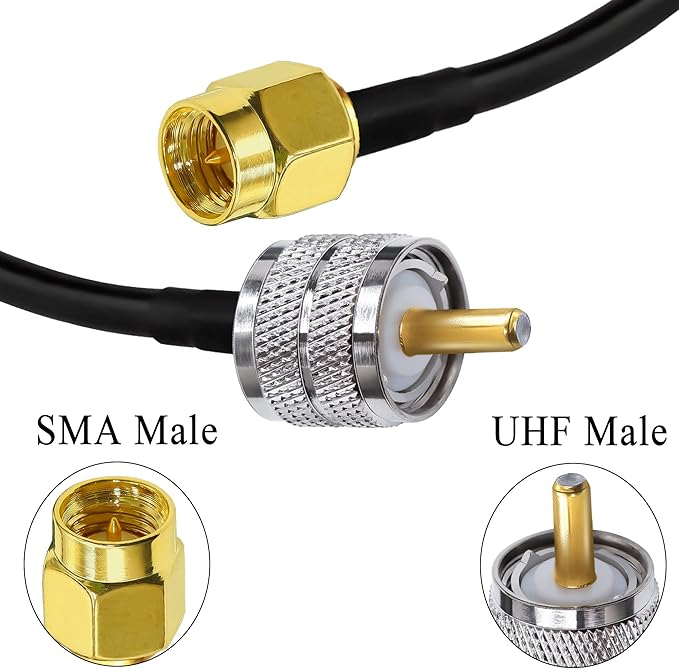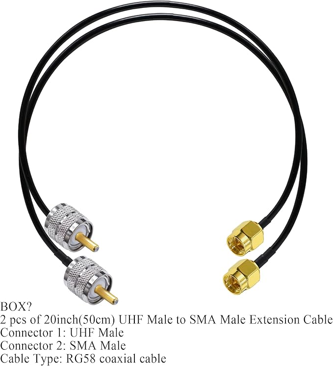 【ケーブルの種類と詳細】SMAオス-UHFオス同軸ケーブル。ケーブルタイプ:RG58;導体材質:純銅;ケーブル長:20インチ(50cm);インピーダンス:50オーム、低損失