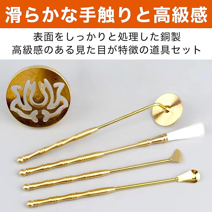 高い耐久性で長く使える:本製品は銅製のお香道具キットであるため、一般的な真鍮製道具に比較して耐久性が高く、長くお使いいただけます。お盆や法事で必要な場合に簡単に使える初心者用のセットです。ゴールドカラーなので、仏壇の見た目を損ないません。