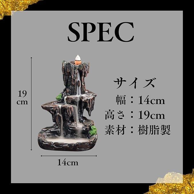 【商品仕様】サイズ:幅14cm 高さ19cm 素材:丈夫な樹脂製 デザイン:滝をモチーフにした自然な岩肌デザイン 対応お香:倒流香(バックフローインセンス)専用 使用場所:リビング、寝室、オフィス、ヨガ・瞑想スペースなど