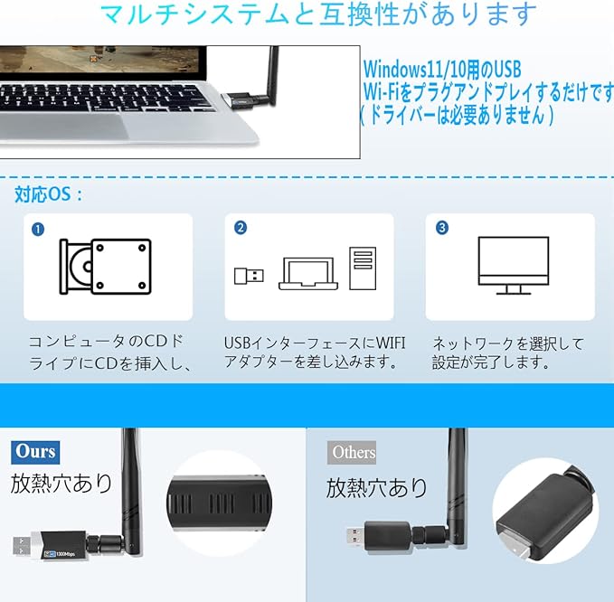 【2つの5dBi高利得アンテナ】2 5dBiアンテナを適用し、古いデスクトップWIFIアダプターよりも幅広い接続に拡張できます。ルーターを取り囲むことなく、コンピューターアダプター経由でスムーズなWIFIをお楽しみください。USB LANアダプタのパッケージに含まれているコンパクトディスクを介してドライバをインストールしてください。