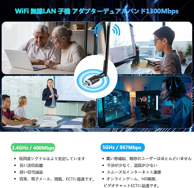 【デュアルバンド5.8GHzおよび2.4GHzバンド】Wi-Fi速度を2.4GHz帯域で最大400Mbps、5.8GHz帯域で最大867Mbpsにします。それは強い浸透で、壁を通してさえ効果的にwifi信号を受信することができます。デュアルバンドは柔軟な接続を提供し、デバイスに最新のルーターへのアクセスを提供して、より高速で範囲を拡大します。