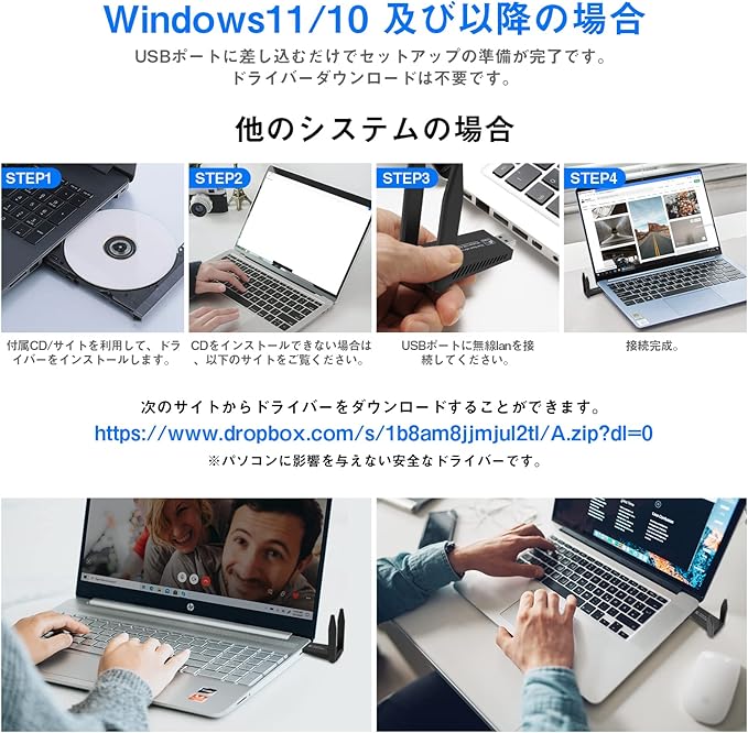 【幅広い互換性・セット簡単】KIMWOODの無線LAN 子機は幅広い交換性があり、Windows 11/10/8.1/8/7/2000/XP/Vista・Mac OS(10.9-10.15)に対応しています。(注:WIN10/11 を自動的に識別し、他のシステムはドライバーをインストールする必要があります。)無線LANは一年の保証サービスを提供するので、何か問題がございましたら、いつでも弊社のサポートチームにお問い合わせください。セット内容:無線LANアダプター本体/インストールCD/日本語取扱説明書。