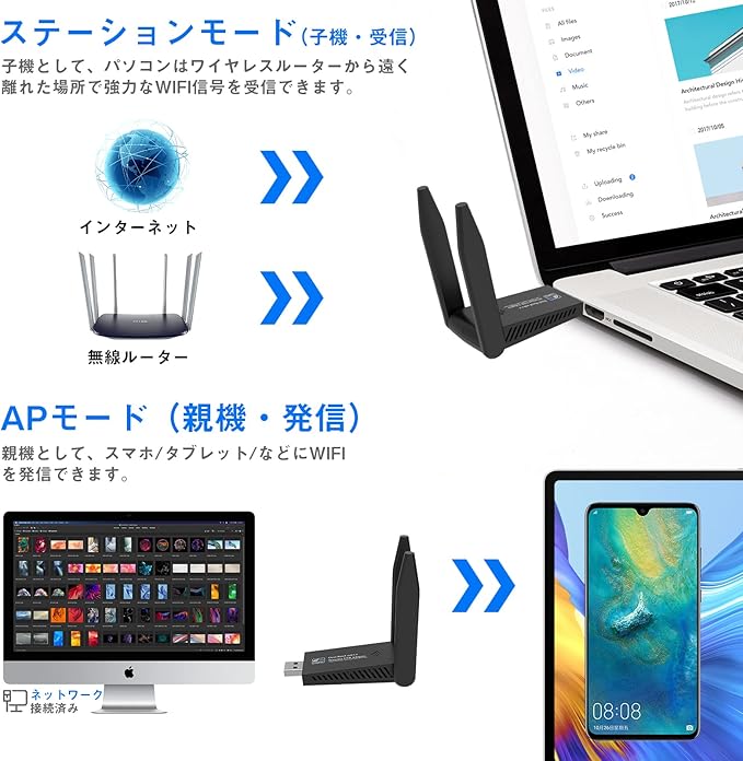 【子機&親機・1台2役】この無線LAN 子機はステーションモード「子機・受信」とAPモード「親機・発信」の2つのモードがあります。子機モードでは、コンピューターは有線ケーブルなしでWi-Fiを受信できます。親機モードでは、無線子機はwifi信号を発信して、複数のデバイスにインターネット接続を提供することができます。 ※ご注意:親機モード対応するシステム:Windows7/8。親機と子機同時に使用することは不可です。