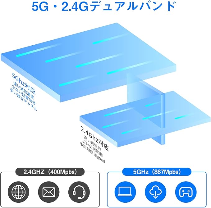 【1300Mbps超高速転送・信号安定】KIMWOODの無線LAN 子機は400Mbps(2.4G)+867Mbps(5G)の高速通信を実現しました。2.4Gの信号帯では、浸透力が強く、厚い壁を通しても効果的に信号をカバーすることができます。5Gの信号帯では、電波の干渉に強く、より高速なインターネット接続が可能になります。また、最新のWIFI技術である802.11acでは、wifi 子機がさらに高速で安定した信号の伝送が可能です。