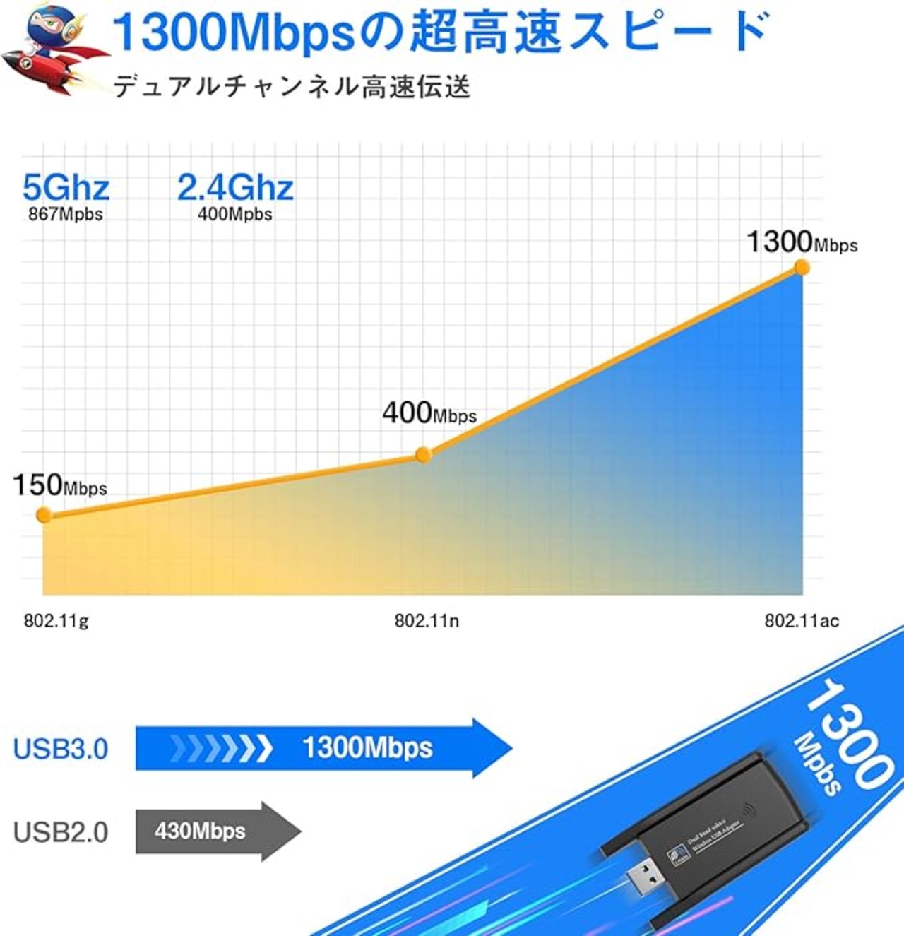 無線lan 子機 KIMWOOD wifi usb 1300Mbps 2.4G/5G デュアルバンド USB 3.0 wifi 子機 5dBi超高速通信 回転アンテナ 802.11ac/n/a/g/b技術 放熱穴付き WPS暗号機能 Windows11/10/8/7/ XP/Vista/Mac OS対応 認証済み 日本語取扱説明書
