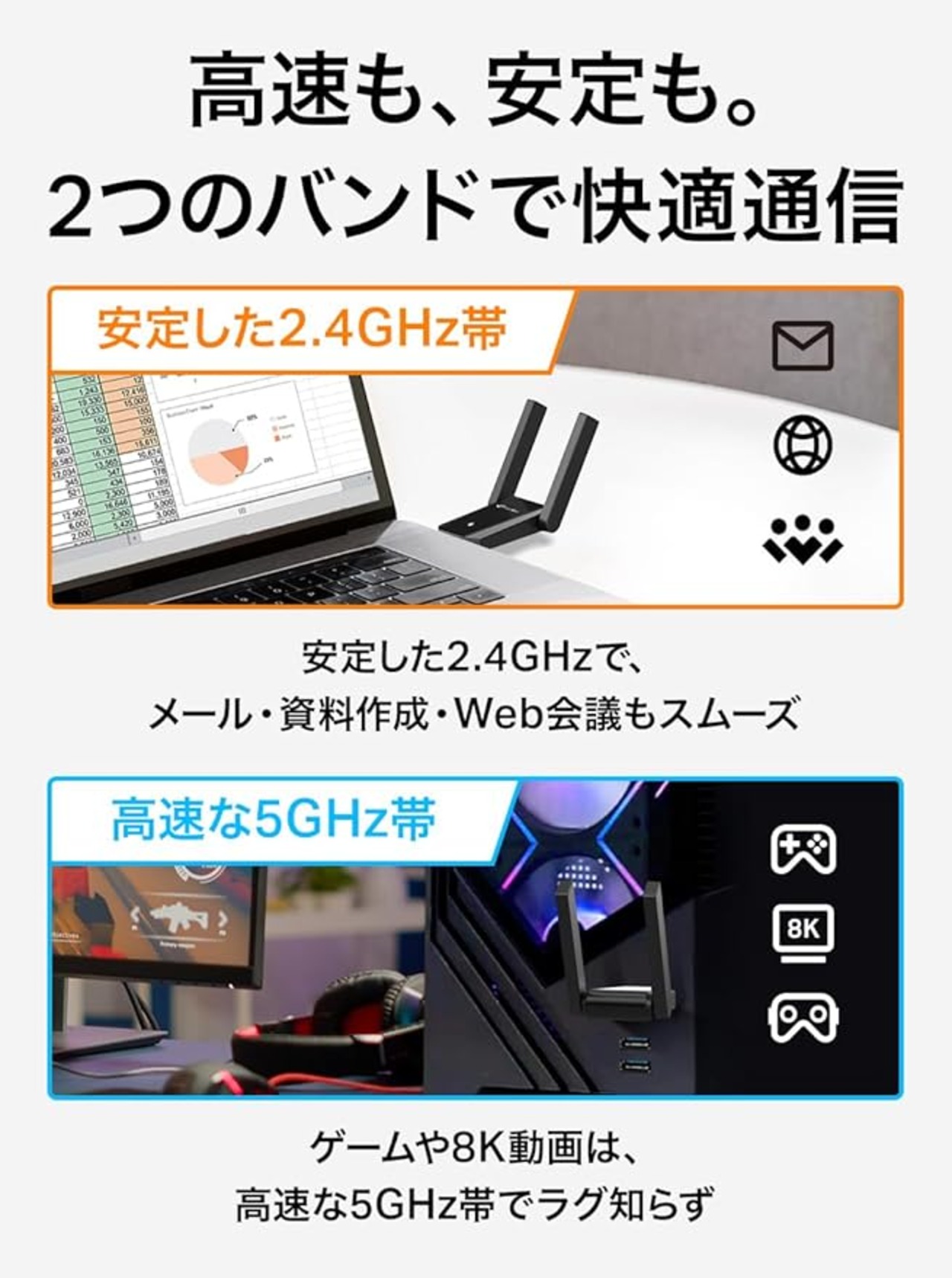 【 幅広い互換性】Windows 11/10対応、デスクトップPCやノートPCのWi-Fi増設・後付けに最適。
