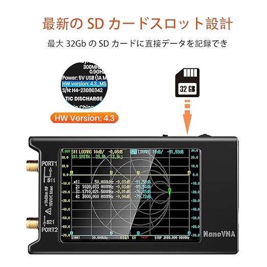 MicroSDカードポート(最大32GBのメモリカードをサポート)を装備しており、いつでも測定データやスクリーンショットを保存することができます。 TX/RXメソッドは、完全なS11/S21パラメータを測定することができます(トランシーバポートの配線を手動で変更する必要があります)