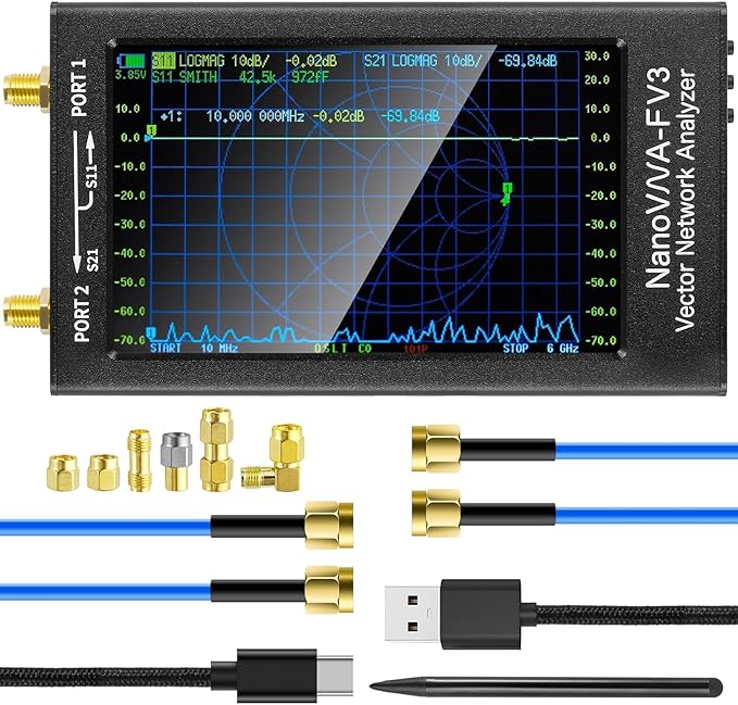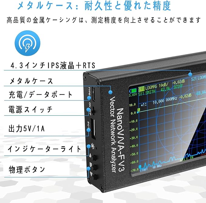 NanoVNA-F V3 ベクトルネットワークアナライザ、1MHz-6GHz 4.3 インチ HF VHF UHF VNA アンテナアナライザ、801スキャンポイント,測定Sパラメータ電圧SWR、位相、遅延、スミスチャート、RTCリアルタイム