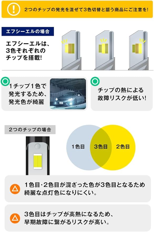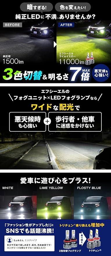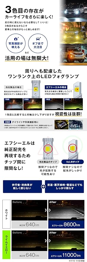純正LEDフォグランプ採用の最新車のフォグを明るく!そして3色切り替えを楽しむことができる、フォグレンズユニットとトリプルカラーチェンジ LEDフォグランプのセット。既に2色切替を試したことがある方、フォグのカラー選択でお悩みの方、遊び心も忘れたくない方におすすめ。3色展開で様々なカラーにチャレンジしやすくなりました。王道カラーのホワイト(白色)、視認性の良いライムイエロー、チャレンジカラーとしてイエロー(黄色)とフロスティブルー(青)、そしてアンバー(オレンジ)をご用意。他の3色LEDバルブとは違う、独自のチップ配置、発光の仕組みでこれまでにないフォグ体験をあなたに!【ledフォグランプ バルブ形状:h8 h11 h16】毎日をカラフルに!日常に遊び心を!fclのトリチェンで新時代をいくフォグランプを。
