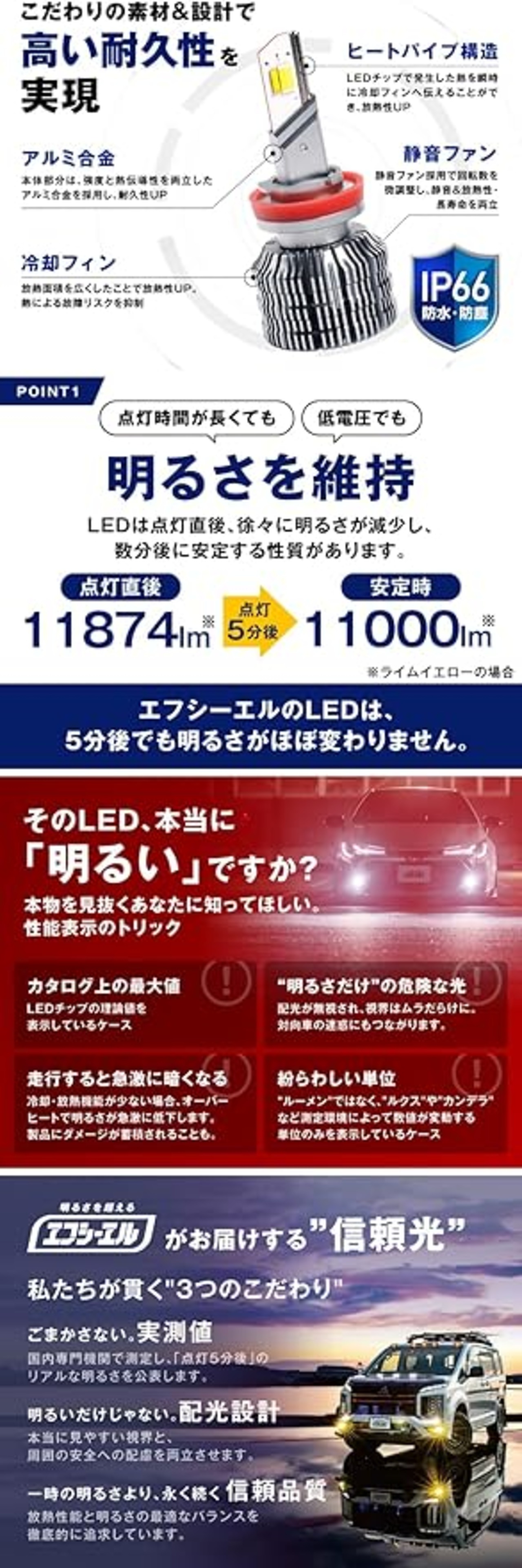 【熱に強く、常に安定した明るさ】高効率の静音冷却ファン、熱伝導率の高いヒートパイプ構造、耐久性の高いアルミ合金を組み合わせた独自の冷却システムを搭載。点灯5分後でも明るさがほぼ落ちない安定したパフォーマンスを実現し、長時間のドライブでも安心です。