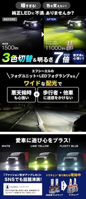 ■車検について:・フロスティブルーは車検非対応カラーです。・ライムイエローは車検基準を満たす黄色ですが、検査官の判断により不適合となる場合がございます。検査時はホワイトに切り替えてください。 ※メモリー機能付きのため、車検を受ける前にホワイトで点灯するかご確認ください。 ■取付不可車両:純正フォグ24V車/輸入車/純正フォグランプユニット未装着車/純正バイカラーLEDフォグランプ装着車 ※車種・グレードによっては取付できません。必ず適合表をご確認ください。特に下記の車種は購入間違いが増えているためご注意ください。【ノア 90系】S-Z/S-Gグレード:フォグユニット タイプB / Zグレード、Xグレード(後期のみ):L1Bバルブ