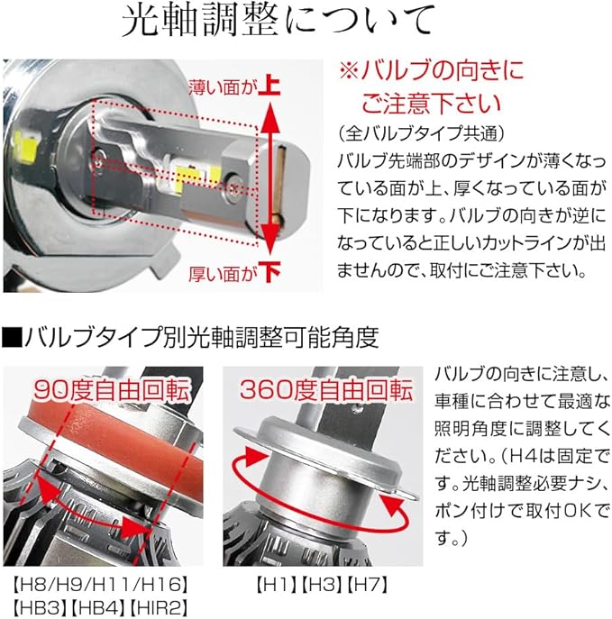 【光軸調整について】バルブの向きにご注意下さい(全バルブタイプ共通)バルブ先端部のデザインが薄くなっている面が上、厚くなっている面が下になります。バルブの向きが逆になっていると正しいカットラインが出ませんので、取付にご注意下さい。バルブの向きに注意し、車種に合わせて最適な照明角度に調整してください。