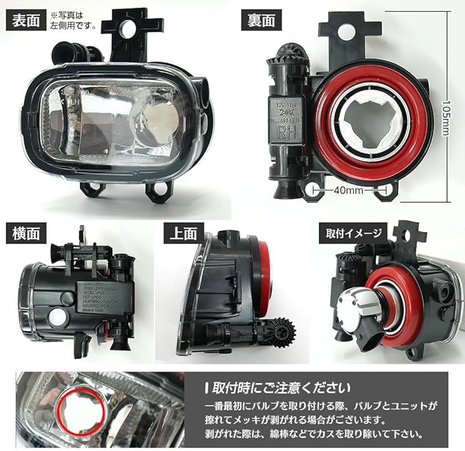 【交換時の防水加工について】フォグランプは運転中に水がかかる可能性が高く、走行中に水が侵入したりレンズが曇る事があります。お取り付けの際はレンズと本体の間の隙間部分にシーリング材などを使用して防水コーキング処理を行ってください。