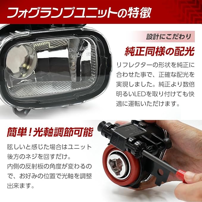 ■注意事項■※年式、グレード、オプション装備の違い(社外エアロや特別仕様車)でフォグランプの形状が違う場合があります。ご購入前に必ず取付車輌の純正フォグランプユニットの形状をご確認ください。 ※走行中の飛び石などによる損傷は保証対象外となっております。 ※地域によっては車検に通らない場合もございます。念のため純正のフォグユニットは車検用として保管下さい。 ※当製品はLEDバルブ専用品です。HIDバルブには対応しておりません。