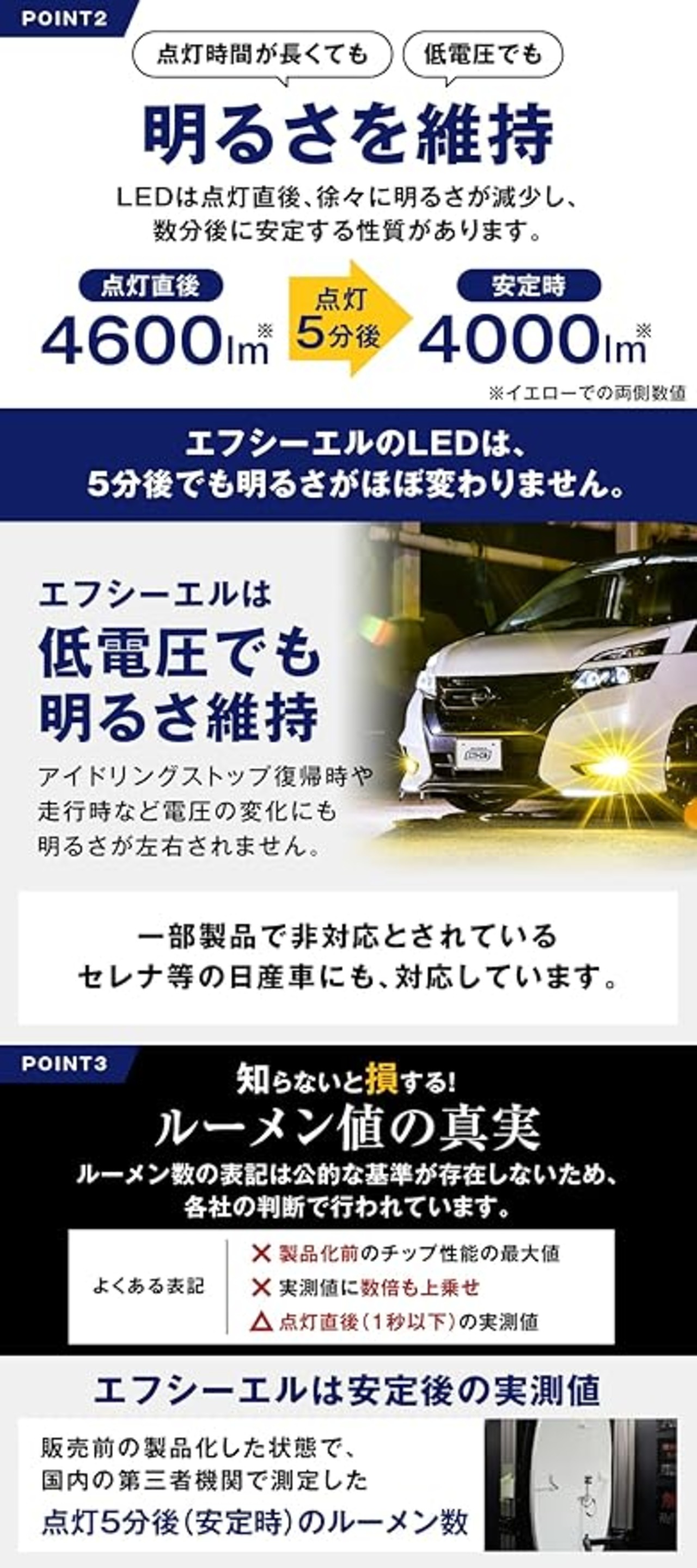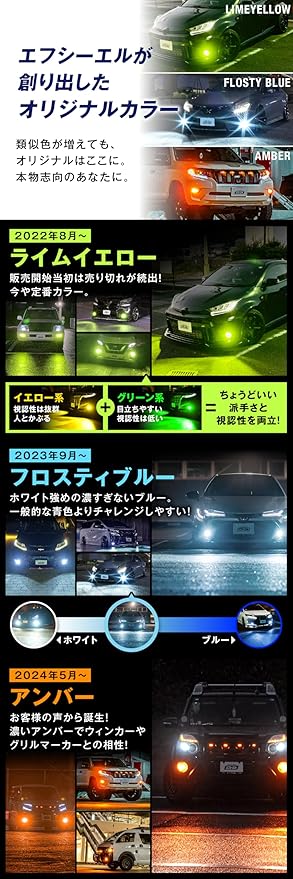 【選べるオリジナルカラーで差をつける】 定番のホワイトやイエロー(黄色)に加え、fcl.だけのライムイエロー(緑味のある黄色)、フロスティブルー(白味の強い青色)といったオリジナルカラーも選択可能。他とは違う、あなただけのカスタムパーツとしておすすめです。【便利なメモリー機能搭載】 エンジンOFF直前のled点灯色を記憶。オートライト作動時や再始動の際も、意図せず色が変わるストレスがなく、毎回色を合わせ直す手間を省きます。