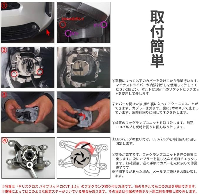 取り付けが簡単: ①車種によっては、作業前にロアカバーを取り外す必要がある場合があります。 マイナスドライバーまたはライナーストリッパーを使用して、2 本のピンを取り外します。 10mmソケットとラチェットを使用してボルトを取り外します。 ②カバーを開けた後、カプラを手や背中で触って外すことができます。 裏側のネジ3本で固定されているので、反時計回りに回すと外れます。 ③純正フォグランプユニットを取り外します。 純正のLEDバルブを反時計回りに回して取り外します。 ④LED電球を取り付けます。 LED電球を時計回りに回して固定します。 ⑤交換完了です。 フォグランプユニットを元の位置に戻します。 次にカプラーを接続して点灯を確認します。 点灯を確認したら、逆の手順で蓋をして作業完了です。