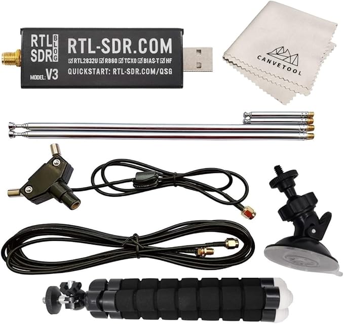 RTL-SDR blog V3ソフトウェア無線レシーバーで、RTL2832U ADCチップ、R860チューナー、1PPM TCXO、SMA Fコネクター、パッシブ冷却アルミニウムケースを搭載しています。最大3.2 MHz(2.4 MHz安定)の帯域幅で500 kHz~1.766 GHzのチューニングが可能。(HFはダイレクト・サンプリング・モードで動作し、性能は低下します)。SDR#、HDSDR、SDR-Radio、GQRX、AndroidのSDR Touchなどのフリーソフトで使用可能。Windows、OSX、Linux、Android、Raspberry Piのようなコンピューターで動作します。このモデルには、他のブランドよりもいくつかの改良点があります。R860チューナー、1PPM TCXO、より良いコンポーネント、再設計された低ノイズPCB、冷却の改善、ESD保護、SMA Fコネクターなどです。また、LNAやアクティブ・アンテナに電源を供給するための、ソフトウェアで起動可能なバイアス・ティーを搭載しています。これは、メインドングルと多目的ダイポールアンテナキットのバンドルです。アンテナキットは、地上波と衛星の受信が可能で、初心者に最適です。屋外への取り付けが簡単で、持ち運びや一時的な屋外での使用に適しています。悪天候時の屋外使用はお控えください。